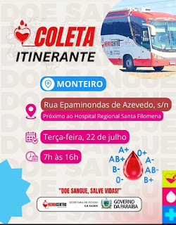 A ação acontece na nesta terça-feira, 22 de julho, na cidade de Monteiro. A unidade móvel do Hemocentro estará estacionada na Rua Epaminondas de Azevedo, s/n, nas proximidades do Hospital Regional Santa Filomena. O horário de funcionamento será das 7h às 16h.